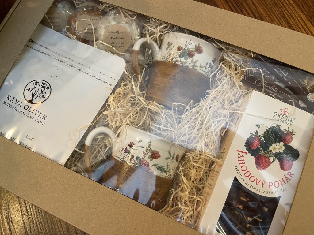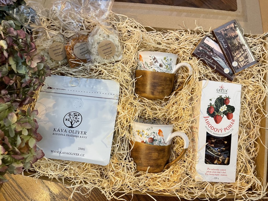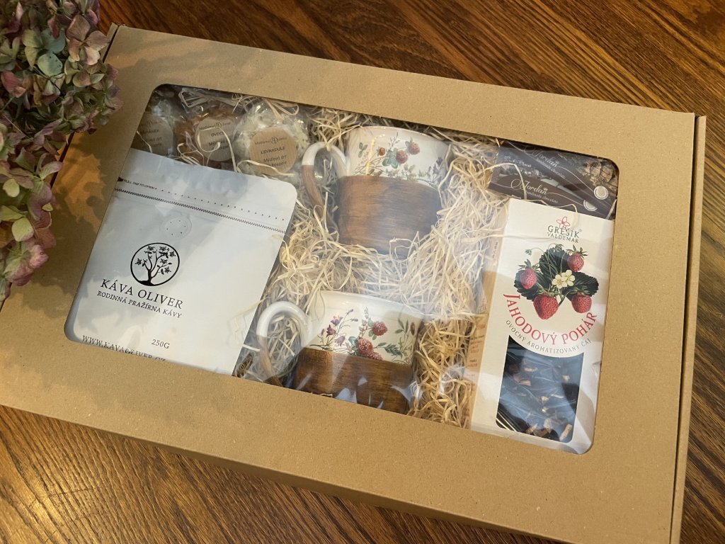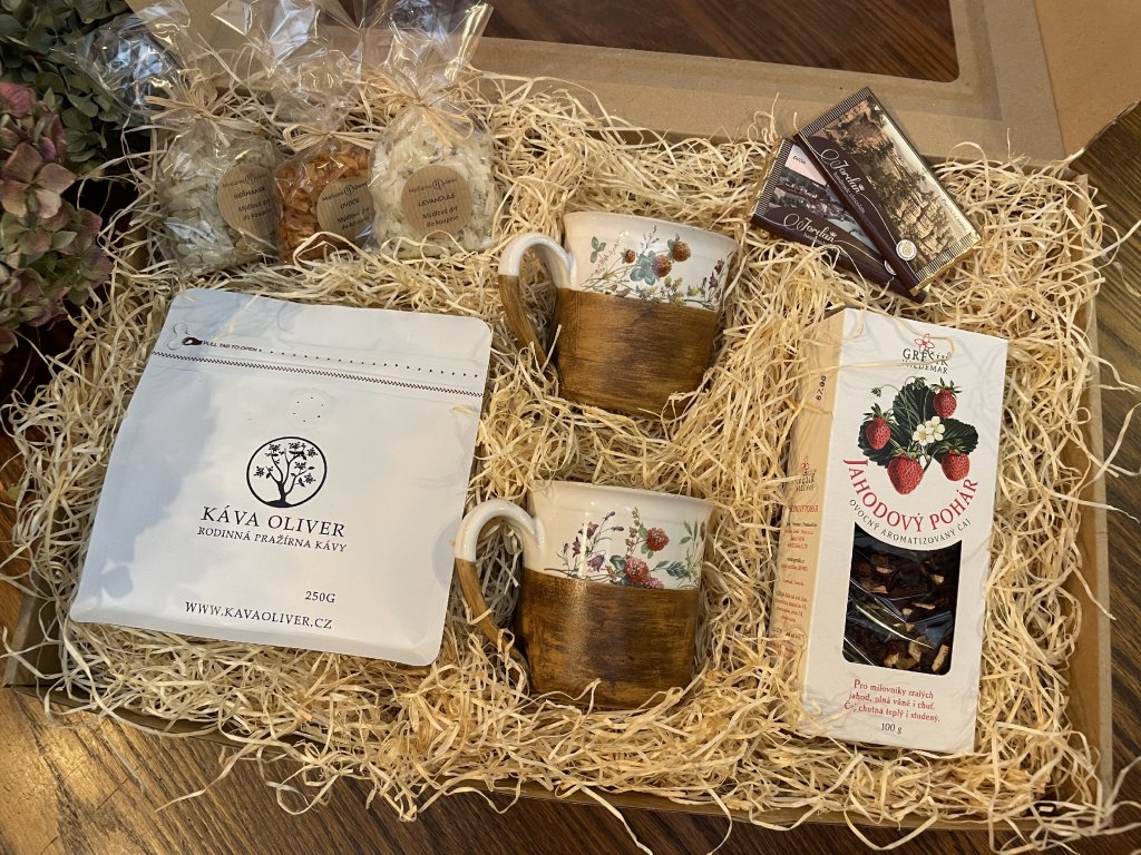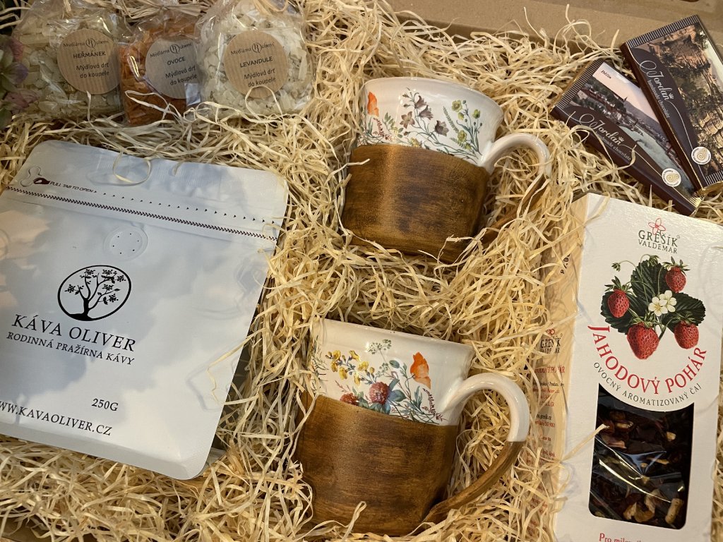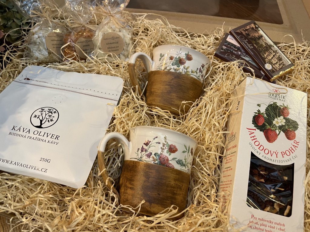 Tento set spojuje ručně vyráběné keramické hrnky s přírodními motivy, čerstvě praženou kávu z rodinné pražírny, voňavé čajové směsi a čokoládové dobroty z místní výroby. Vše pečlivě zabalené tak, aby potěšilo na první pohled i ochutnání.