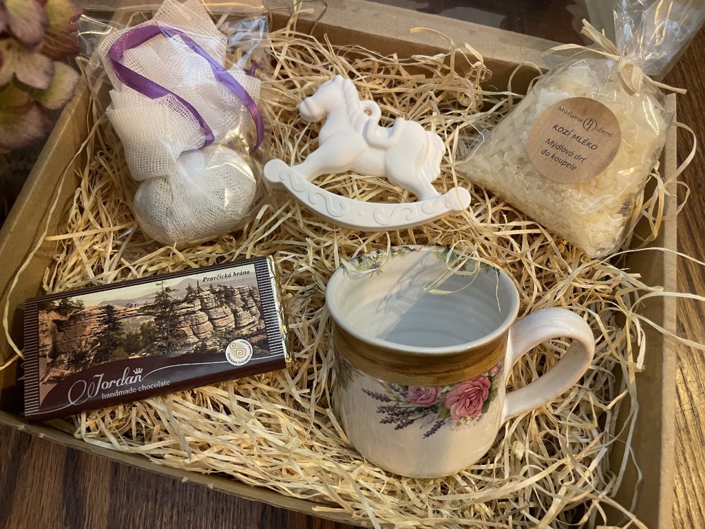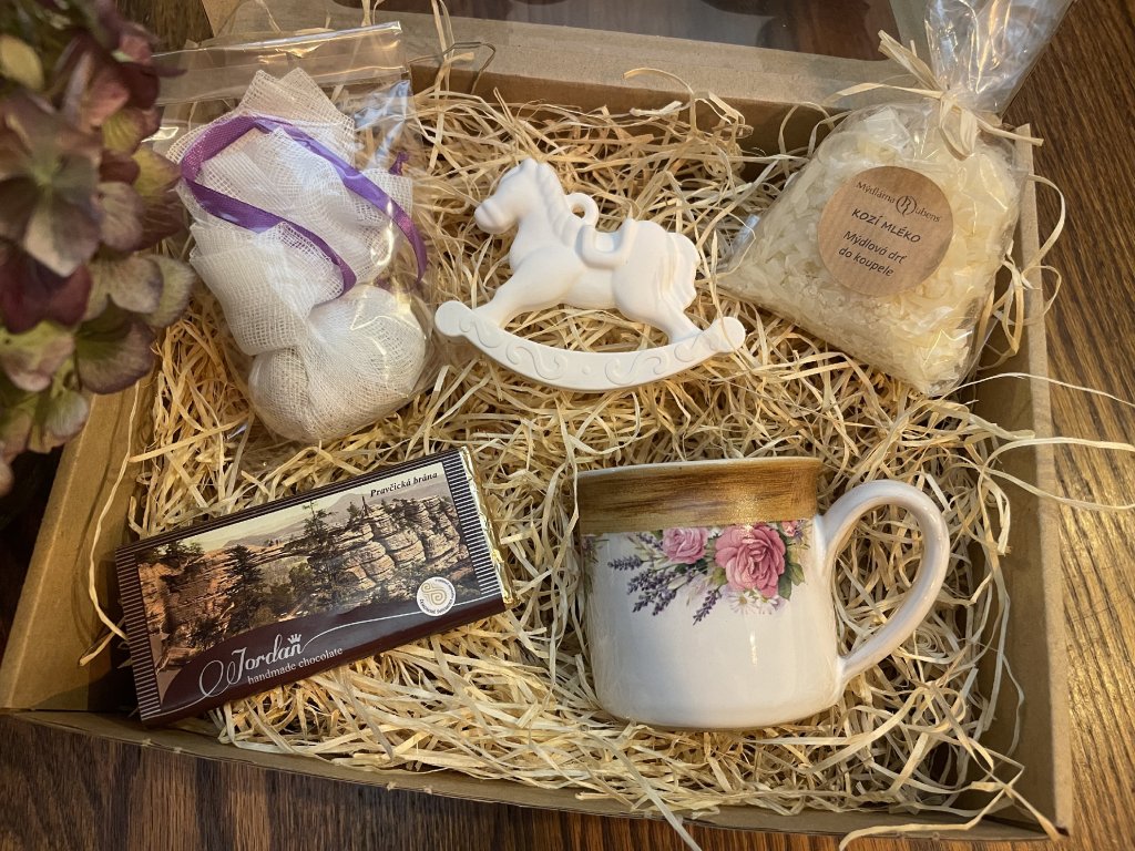 Uvnitř dárkového balení najdete pečlivě vybrané poklady pro tělo i duši - elegantní ručně vyráběný keramický hrníček, poctivou ručně vyráběnou čokoládu, koupelovou mýdlovou drť s kozím mlékem pro samotově hebkou pokožku, jemnou koupelovou houbičku plný bylinek a dekorativního houpacího koníka.