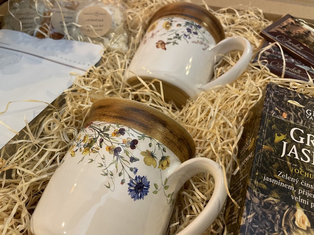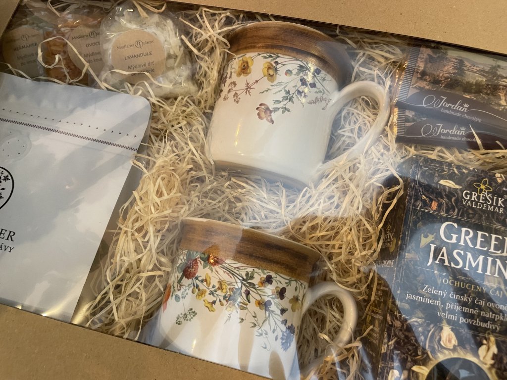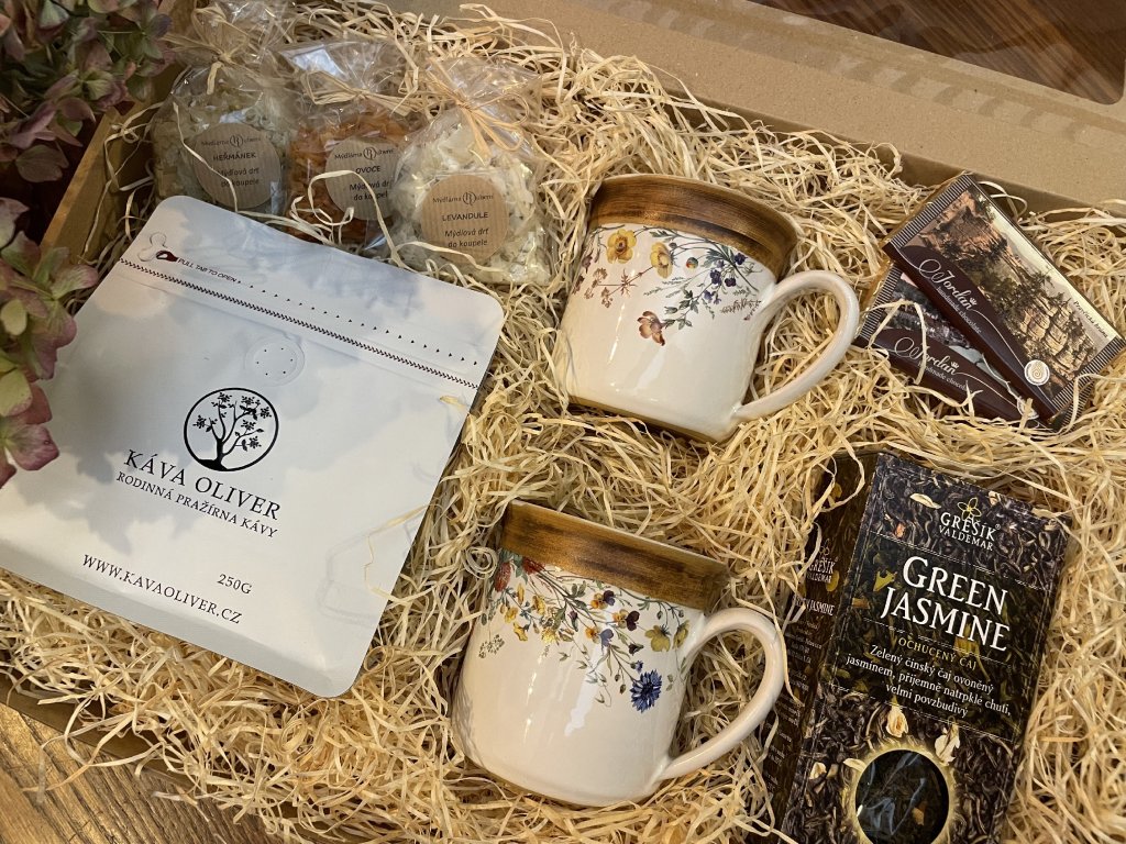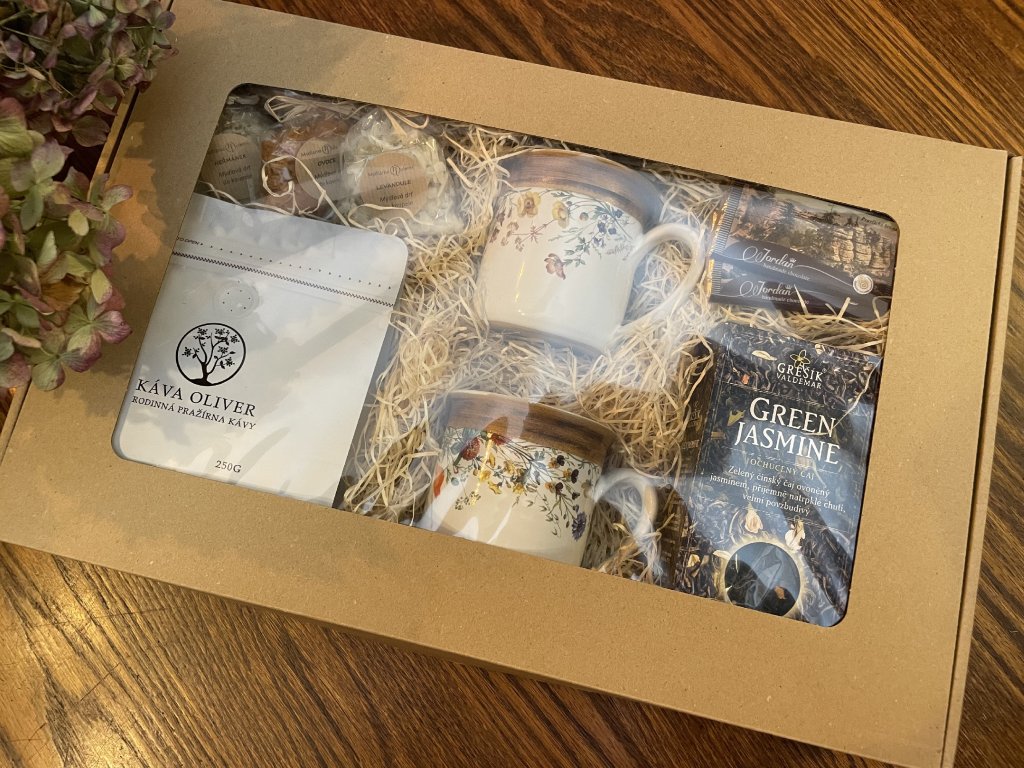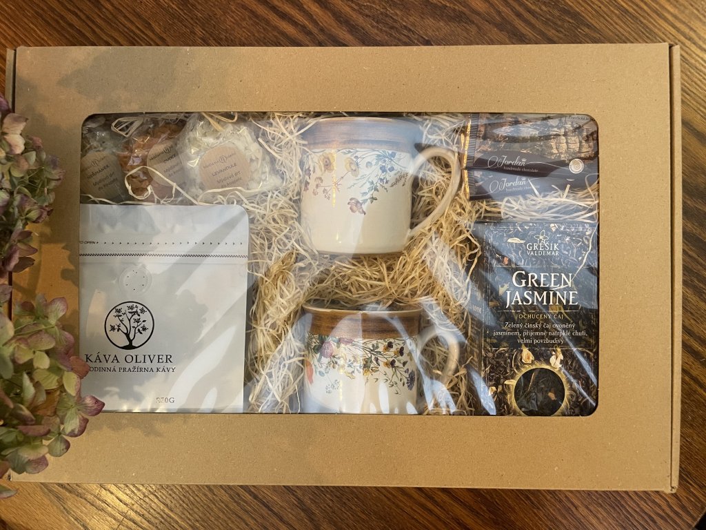 Tento dárkový elegantní balíček je ideální pro všechny, kdo milují klidné chvilky s horkým nápojem a kvalitními dobrotami. Spojuje vůni přírody, poctivé chutě a krásné kvalitní hrnky, které potěší každého milovníka čaje i kávy.