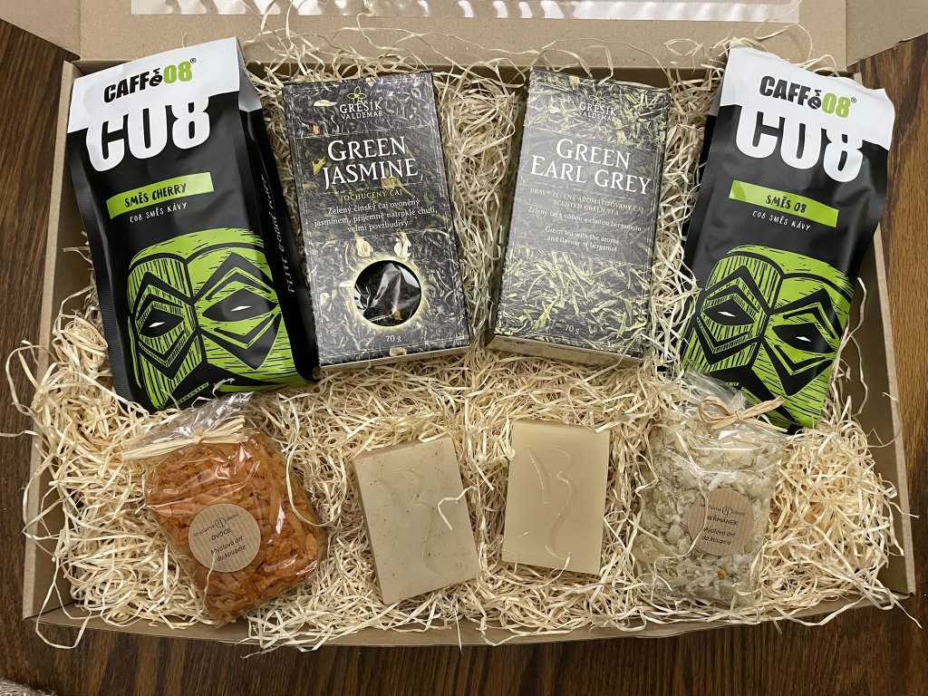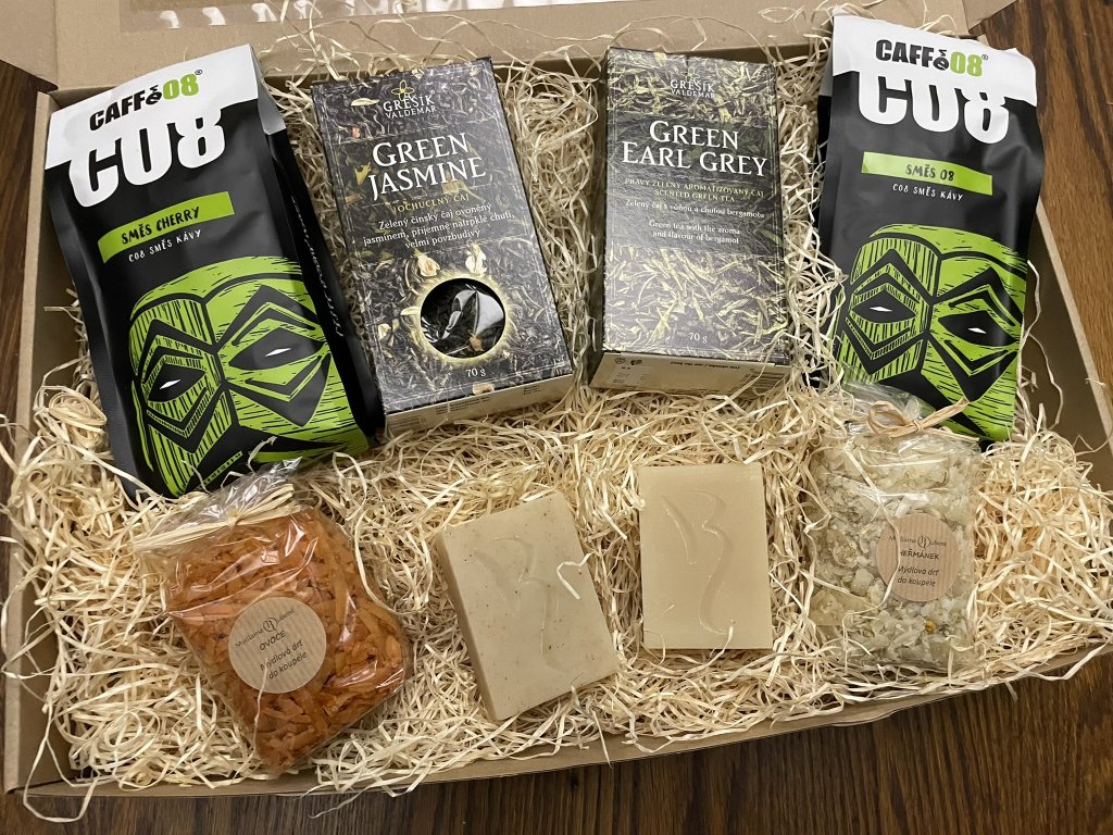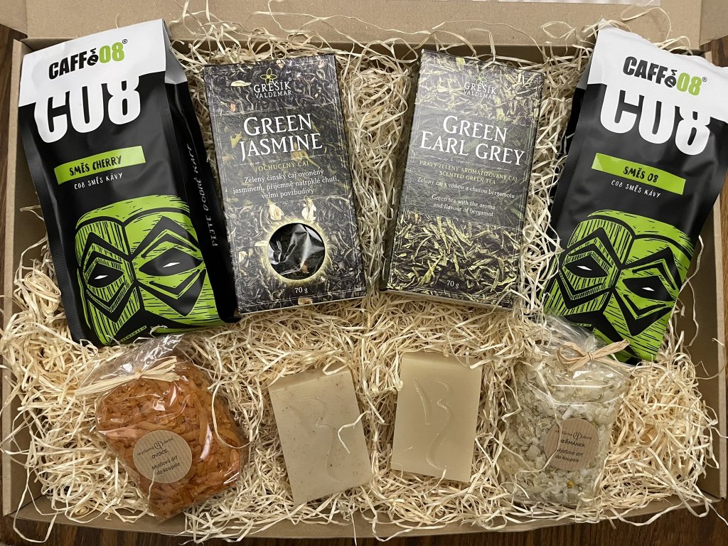 Darujte harmonii chutí a vůní v elegantním dárkovém balíčku, který spojuje osvěžující čaj, poctivou praženou kávu a přírodní péči o tělo.