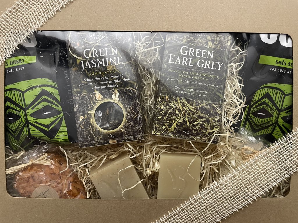 - 2x zelený čaj Grešík Valdemar (1x 70g Green Jasmine, 1x 70g Green Earl Grey) - zelený čaj s vůní a chutí bergamotu.